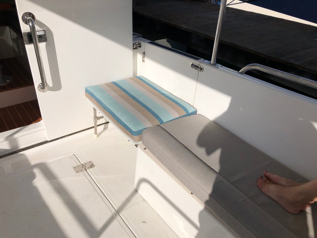 Expansion of the comfortable seating in the cockpit. This increases seating in the cockpit when the cockpit doors are not being used, such as when underway. It makes a nice seat with a backrest while facing forward. It consists of a tubular frame mounted on the top of the cockpit seat. This frame slides back under the cockpit seat when not in use. When in use, you pull it out, attach a board to the top surface (I use a plastic board with clips to attach it to the tubes), and then add the cushion.