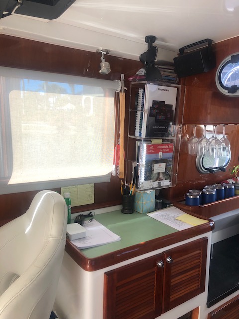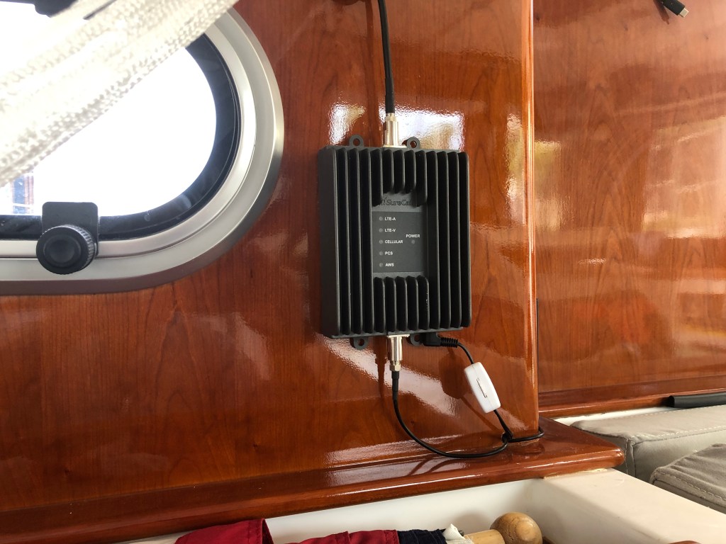 Communication is an important part of cruising. For coastal cruising, the VHF radio has always been a vital link for marine communications. However, in the present age, cell phone communication on the water is very popular, as is WiFi. You are no longer required to be in or close to a marina to get WiFi. You can get it on your cell phone, and using your cell phone as a hotspot, you can receive WiFi anywhere you can receive cell phone signals. Therefore, it behooves us to do all we can to extend the range of reception of our cell phone signal, and if you like Netflix or other streaming services, you want to expand your data usage and rate. Toward this end, I added a Poynting Omni 400, a high-performance LTE antenna, to my mast, connected to a Surecall Fusion 2GO-3 cell phone signal booster. This gives me a significantly greater cell phone range, and when using my cell phone as a hotspot, I have WiFi throughout the boat. We can watch all our streaming channels. Lately, I have been using a Verizon Jetpack MIFI 8800L as my hotspot, freeing up my phone. Also, I added a conventional TV antenna and amplifier for local stations. The 24″ TV is mounted so it swings up out of the way.