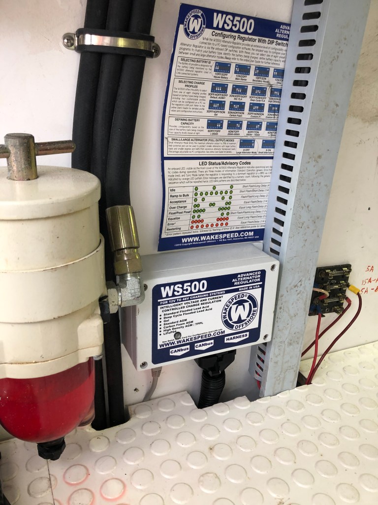 I chose to replace the standard 125A alternator/regulator with a 360A alternator made by American Power Systems. This alternator has a high output, which is more than I will need, but it is better to run an alternator below its rating for reliability reasons. This meant not only replacing the alternator and its mounting but also the pulleys on the engine. I also added a state-of-the-art external regulator made by Wakespeed a WS500.