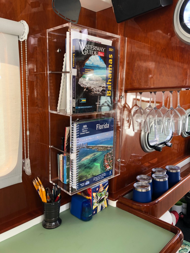 One thing I found lacking in the boat was a bookcase to hold cruising books, instruction manuals, and various reading material. The problem was where to put it, plus what to make it from. After much thought, I decided to make two bookcases, since I couldn’t figure out where to mount only one of a reasonable size. I mounted one over the aft end of the navigation surface and the other over the aft end of the dinette. This gave us two linear feet of bookshelves. Next, the problem was what to use for their construction. I did not feel I could match the color and finish of the wooden bulkheads in the boat, so next to consider was plastics. Starboard came to mind, but I was afraid the stark whiteness would not complement the interior. I settled on acrylic since it seemed less invasive because of its transparency and would thus complement the dominance of the finished wooden interior.
