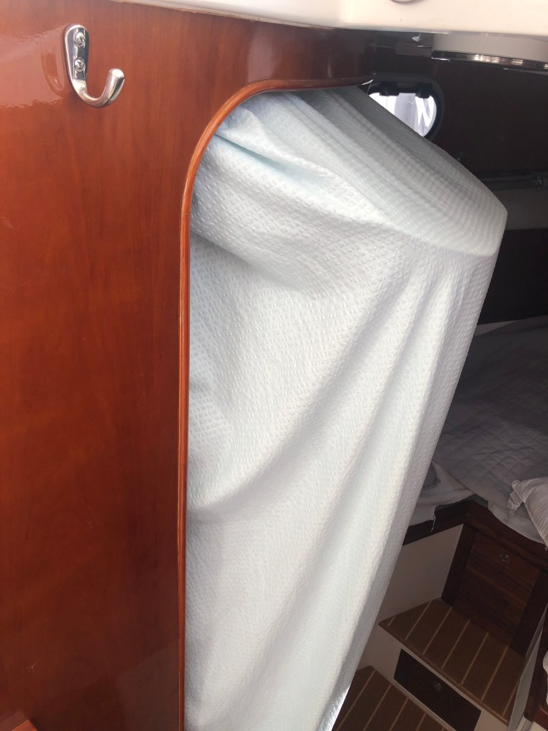 In the fore cabin, we added textilene panels with twist-lock fasteners in front of the shelves on each side of the bunk to make for easily accessible storage.